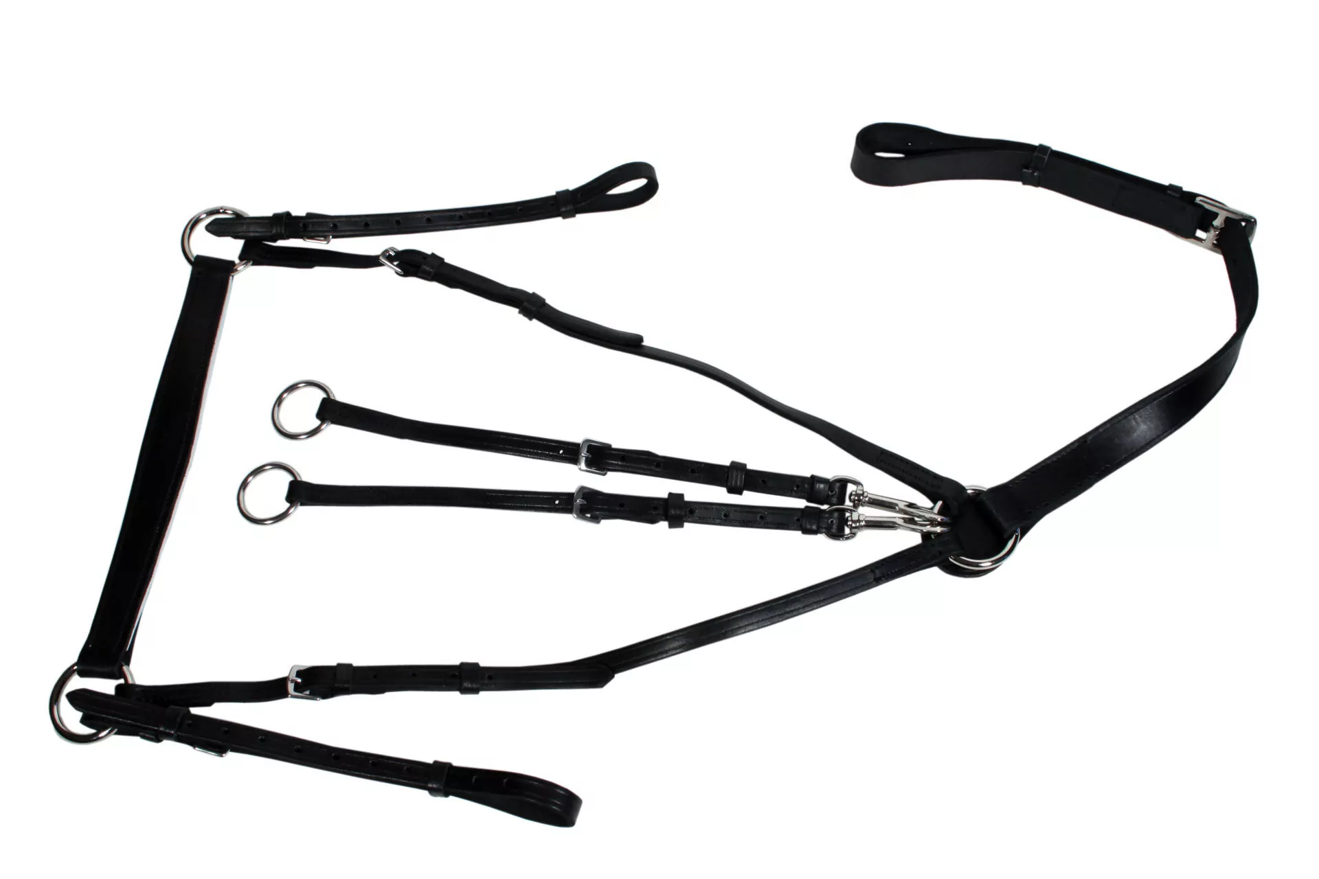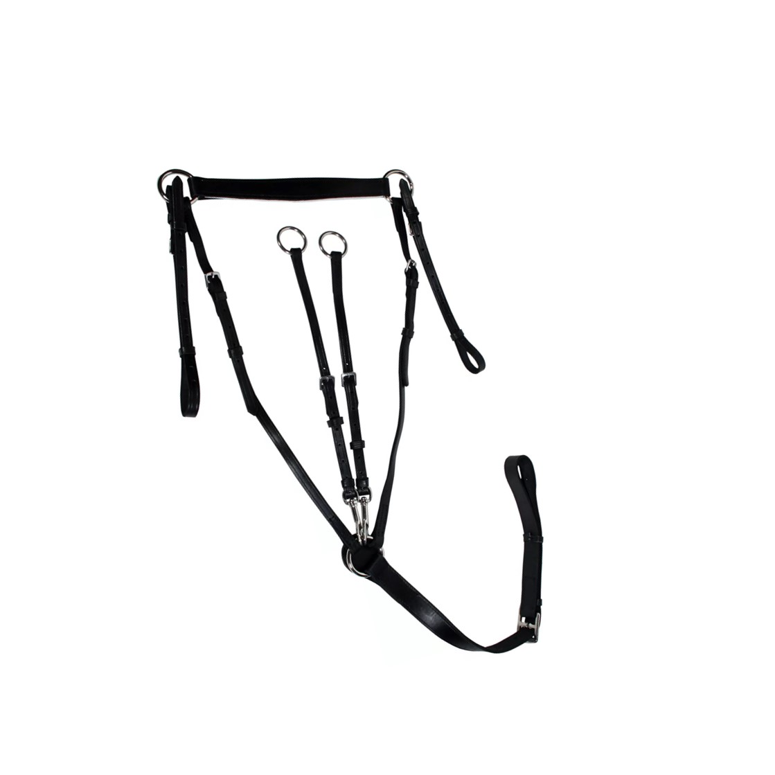 Кожаное подперсье CDpro jumps со съемным мартингалом. Подперсье используется для предотвращения сползания седла назад по спине лошади, крепится к железным кольцам в передней части седла и к подпруге снизу. Так же имеются ремешки-мартингалы, которые ограничивают движение головы лошади, не давая поднимать её слишком высоко. Размер: COB/FULL Цвет: черный, коричневый